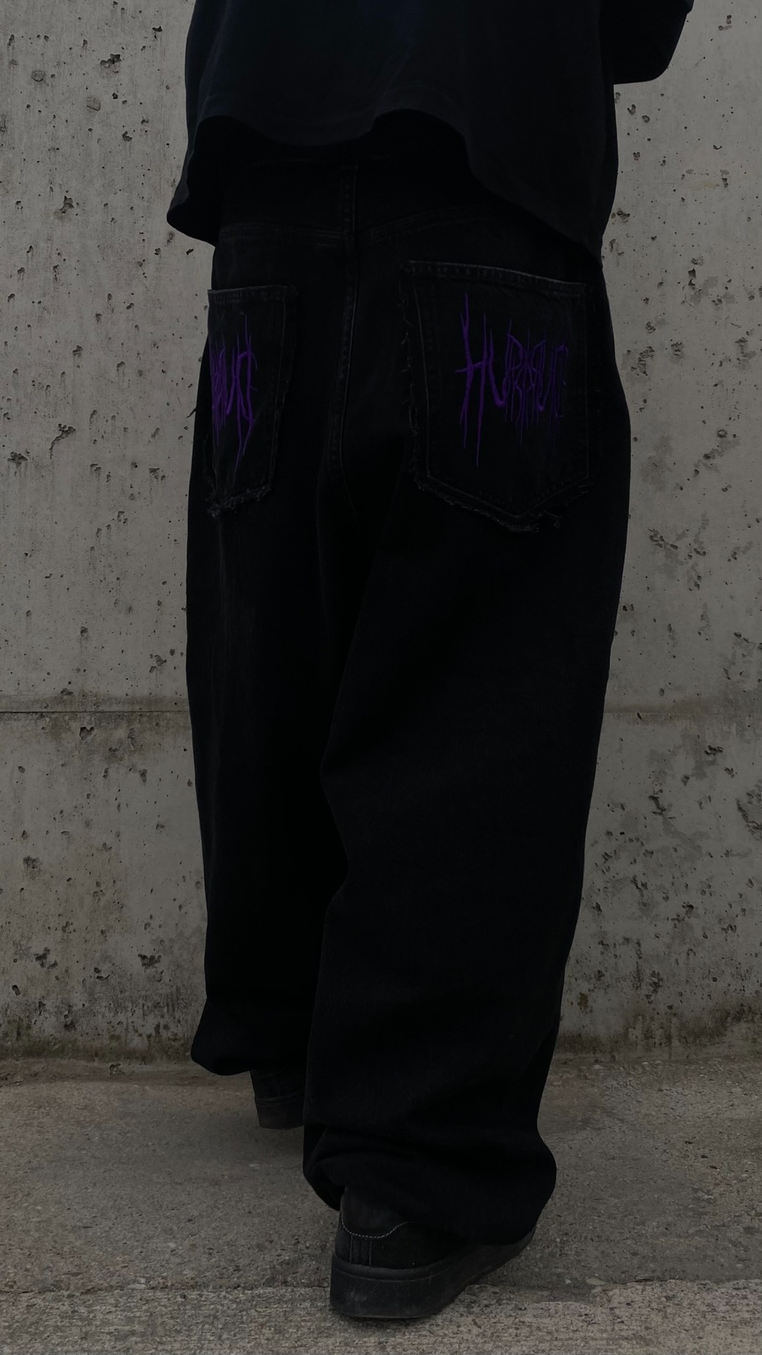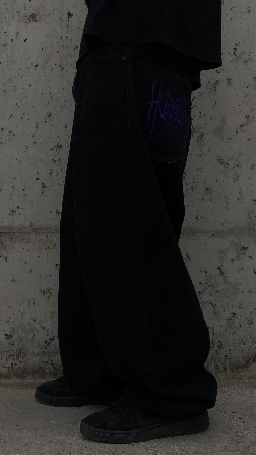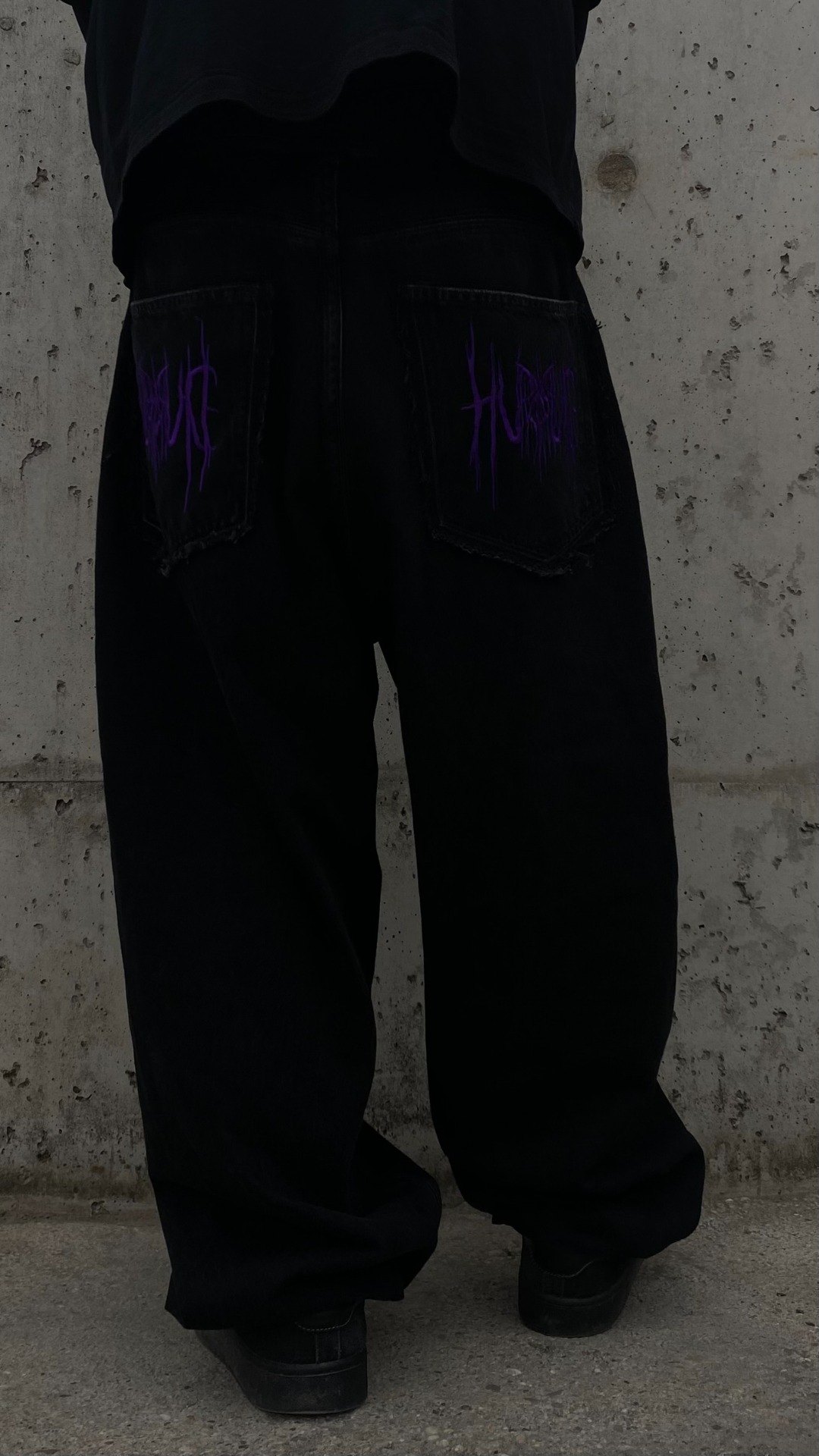 - He is 175cm and 75kg wearing size L, drawstring hem, non distressed, purple embroidery